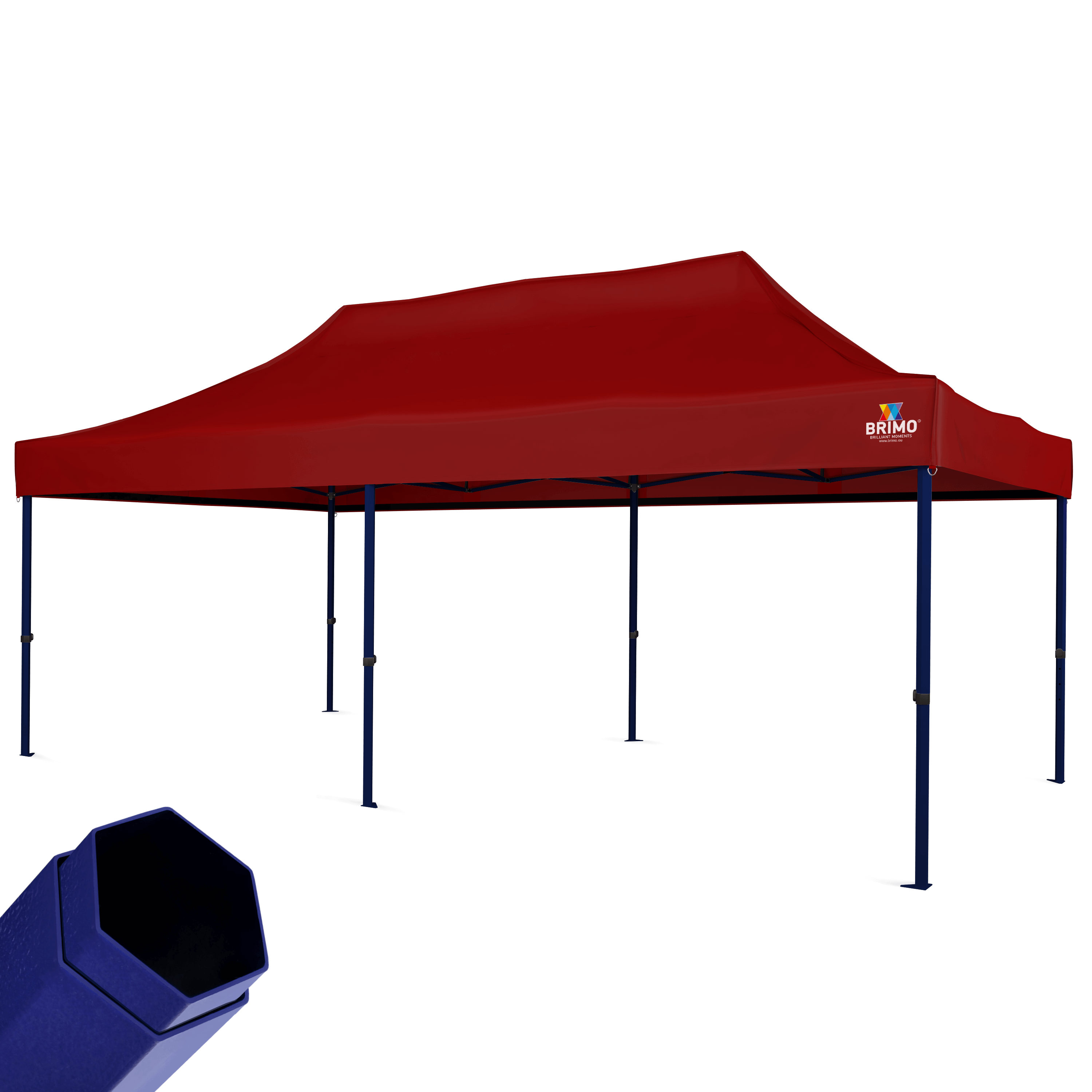 Tenda dobrável azul com detalhe do perfil hexagonal da estrutura.