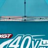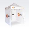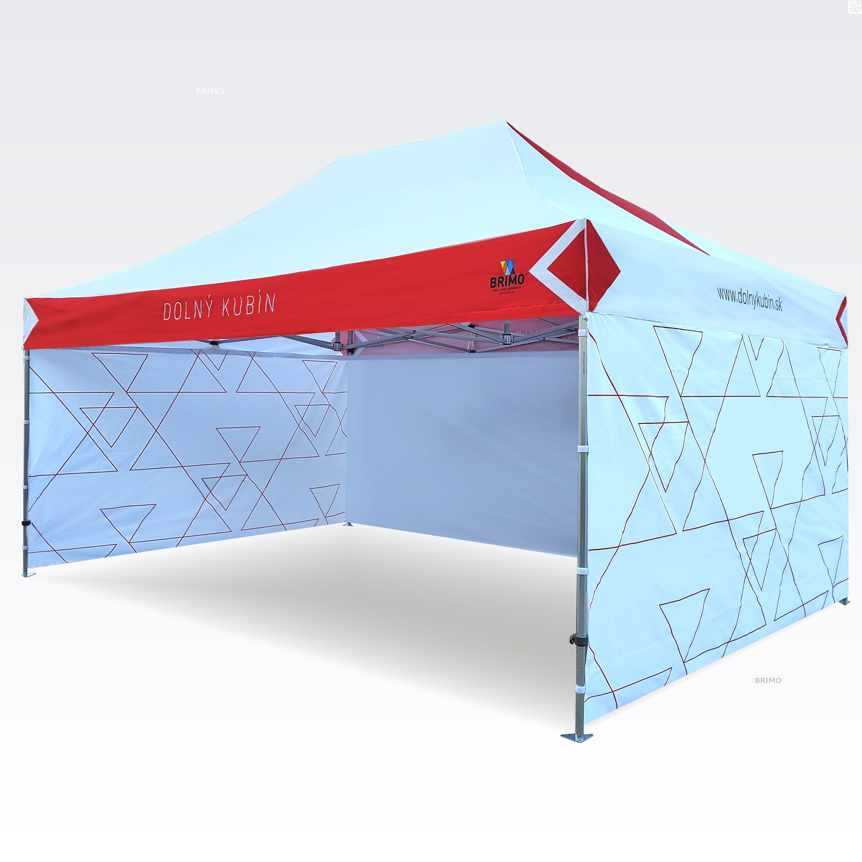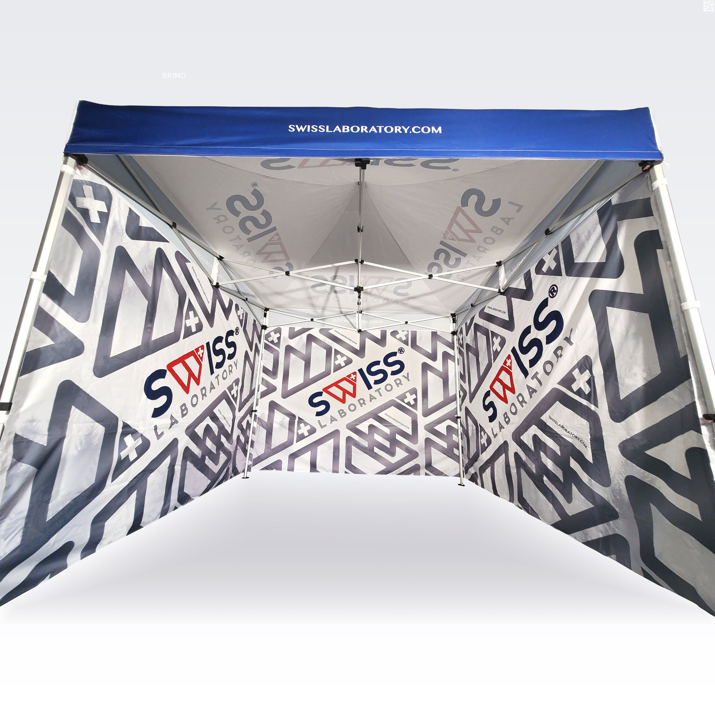 Tendas promocionais com impressão digital por sublimação. A impressão é obtida por meio de um processo químico, no qual a tinta, sob alta temperatura, penetra diretamente na estrutura do tecido. Logotipo, texto ou qualquer tipo de gráfico podem ser impressos no interior ou no exterior da tenda, de acordo com as preferências do cliente.