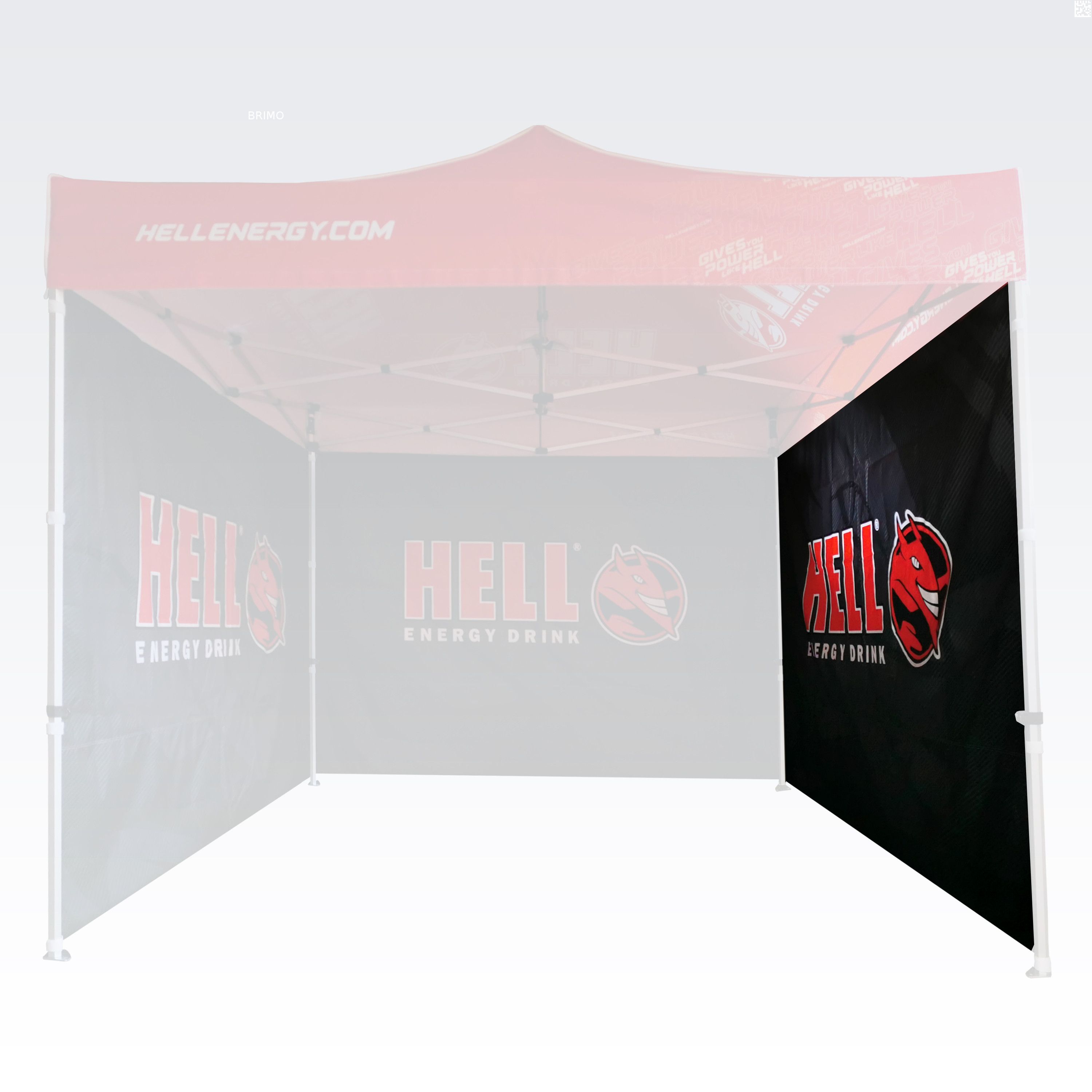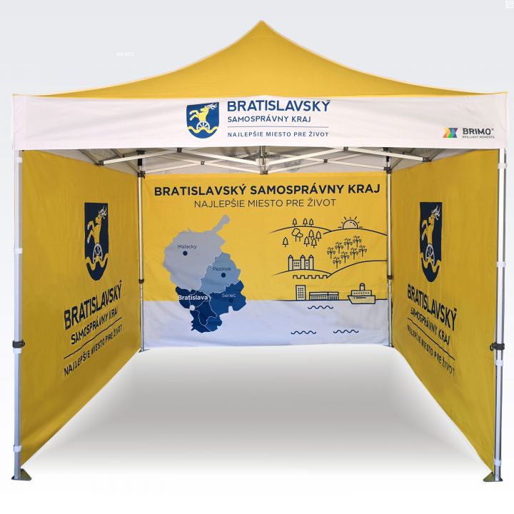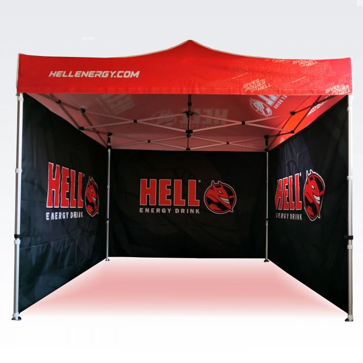 As cores são muito vibrantes, e esse método reproduz perfeitamente cada detalhe da impressão nas tendas publicitárias. As cores fortes e intensas chamam a atenção, e a sublimação garante longa durabilidade sem perda de cor. Com este método, independentemente do tamanho da impressão, o preço permanece o mesmo (o tamanho da impressão não influencia o preço das paredes ou do teto). Quanto maior a impressão, mais visível será a publicidade.