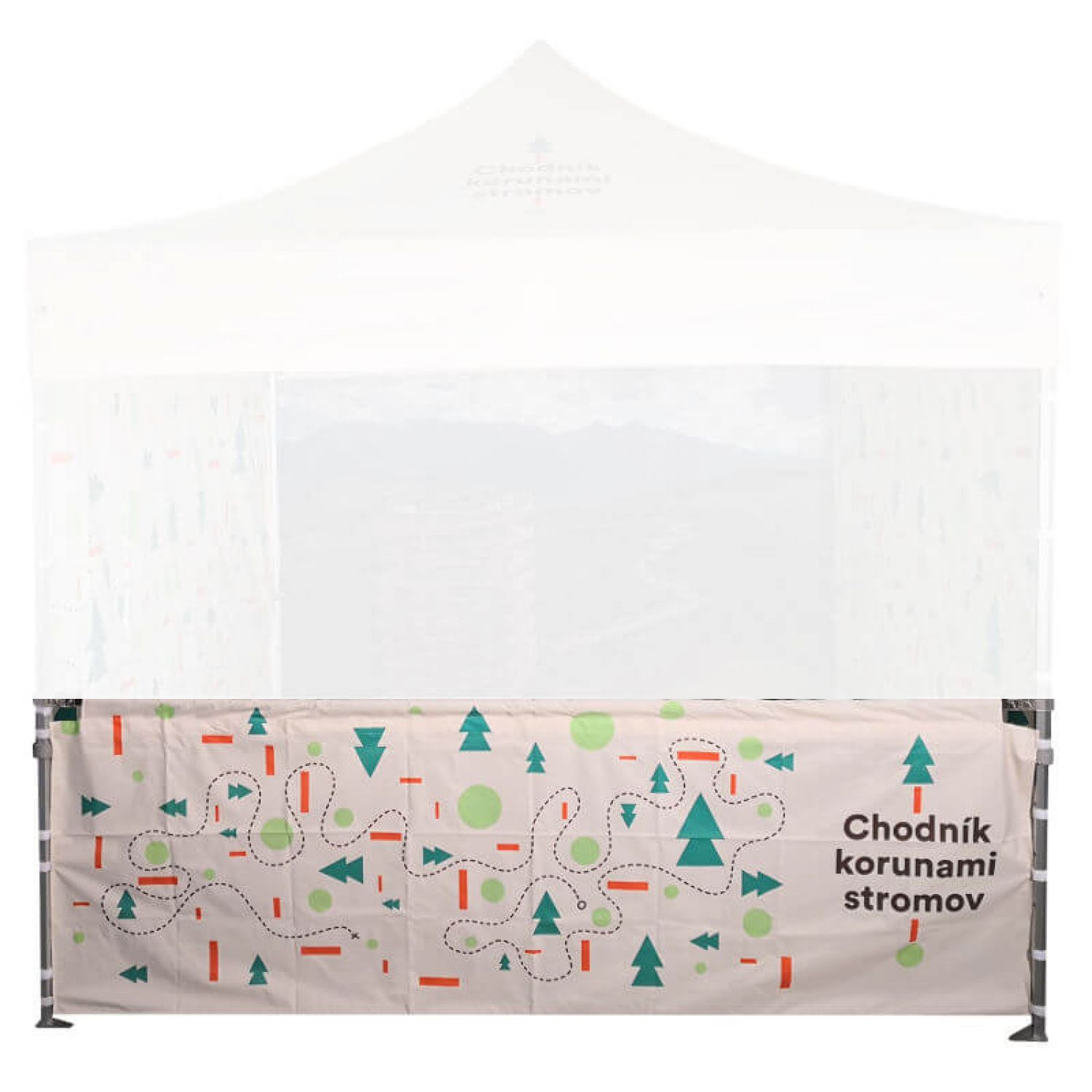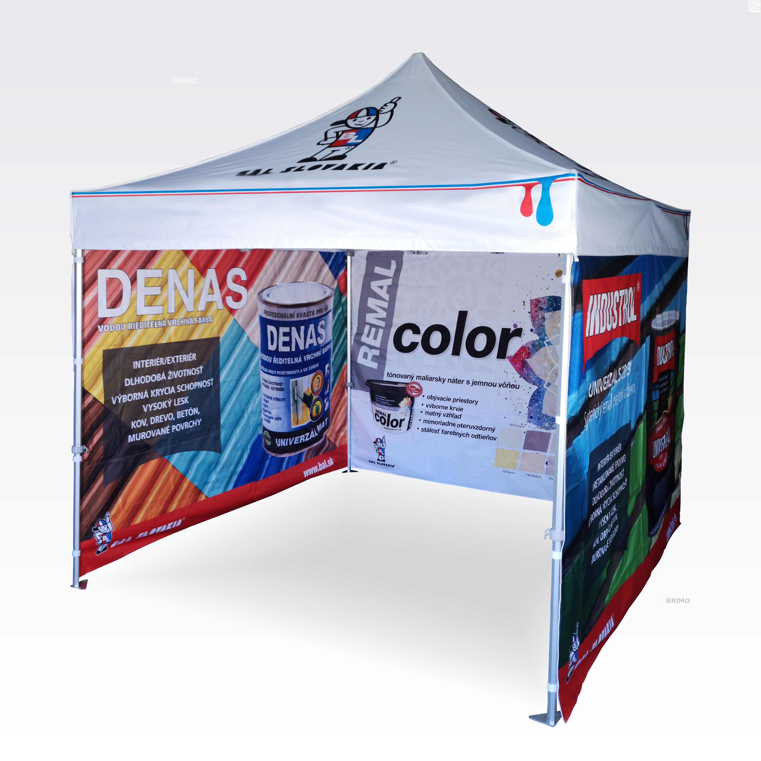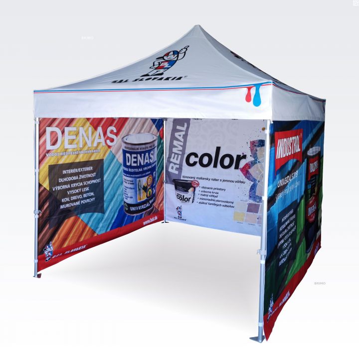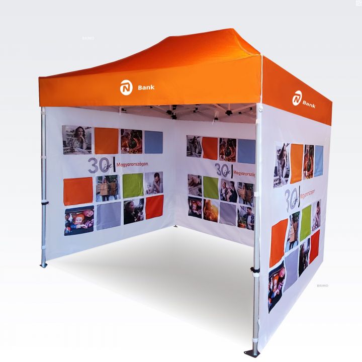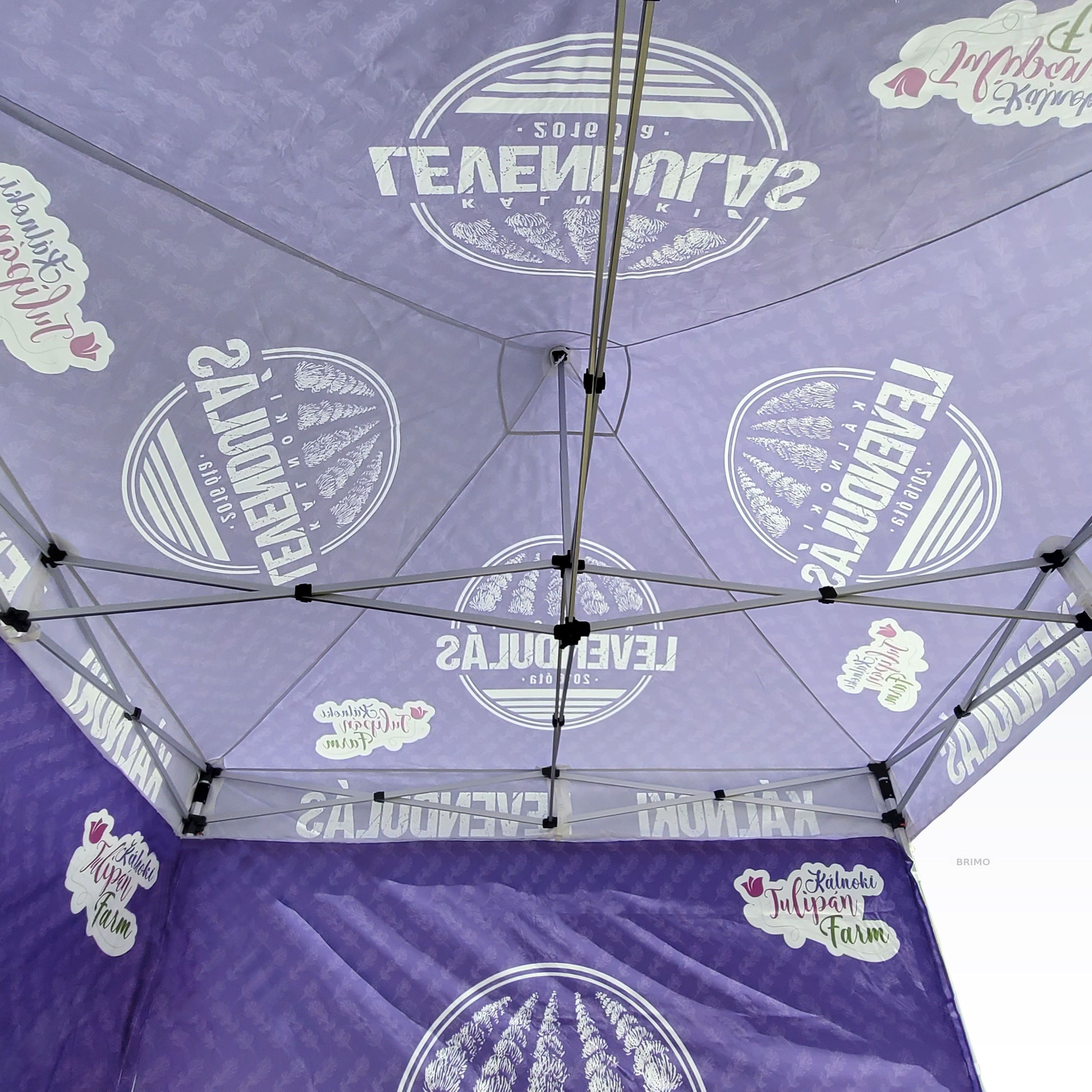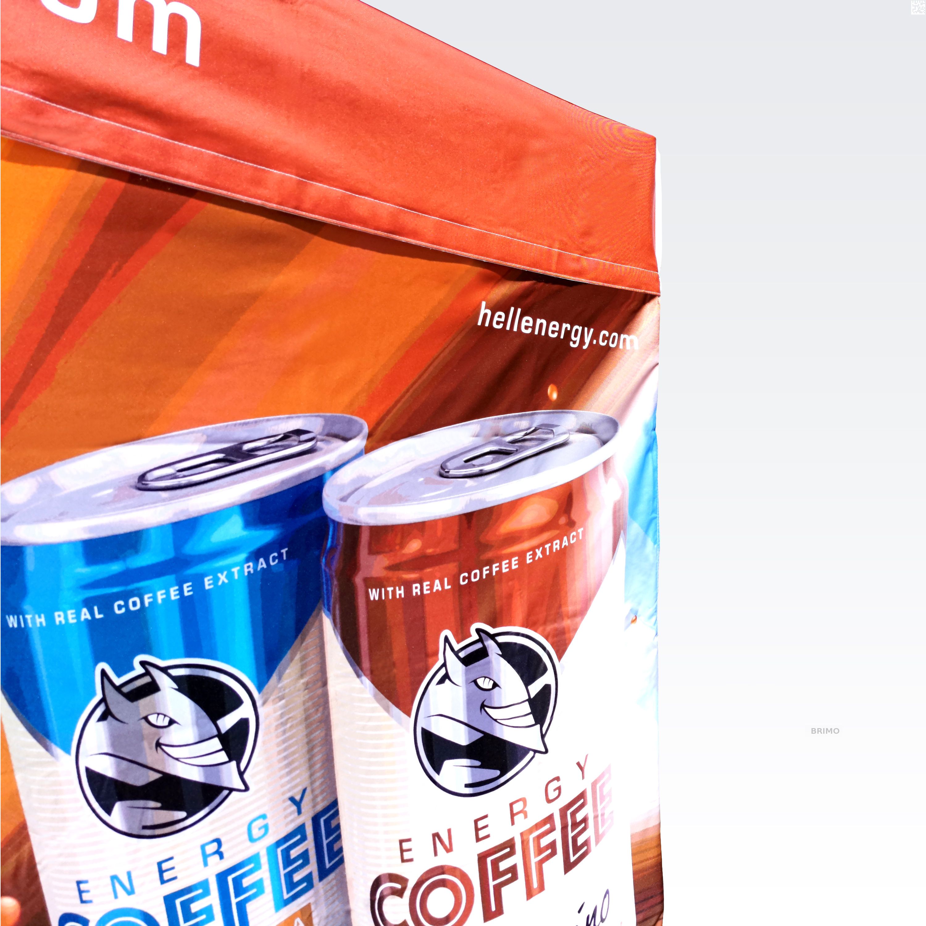 As cores são muito vibrantes, e esse método reproduz perfeitamente cada detalhe da impressão nas tendas publicitárias. As cores fortes e intensas chamam a atenção, e a sublimação garante longa durabilidade sem perda de cor. Com este método, independentemente do tamanho da impressão, o preço permanece o mesmo (o tamanho da impressão não influencia o preço das paredes ou do teto). Quanto maior a impressão, mais visível será a publicidade.