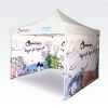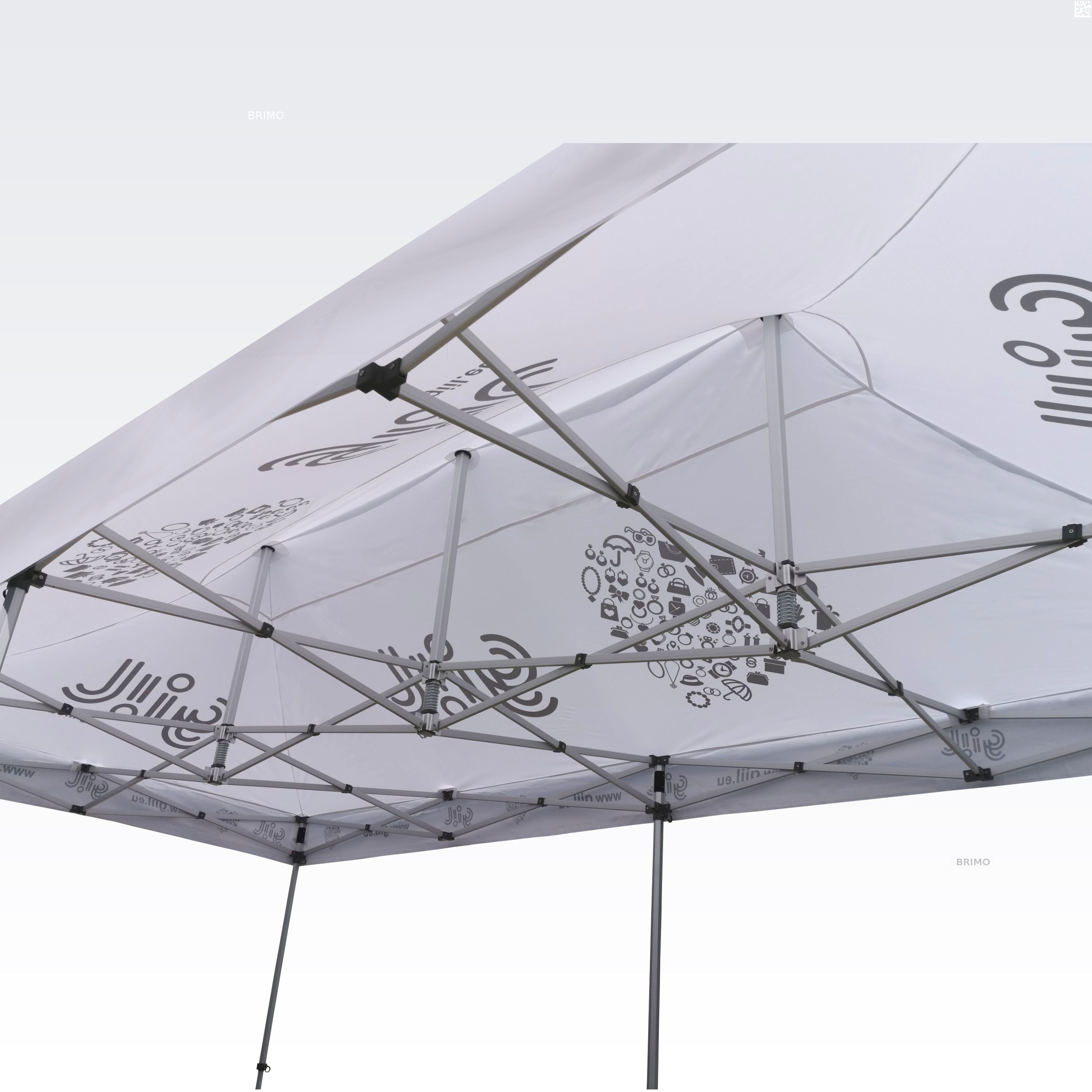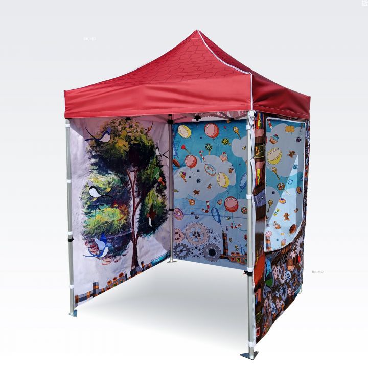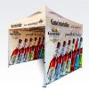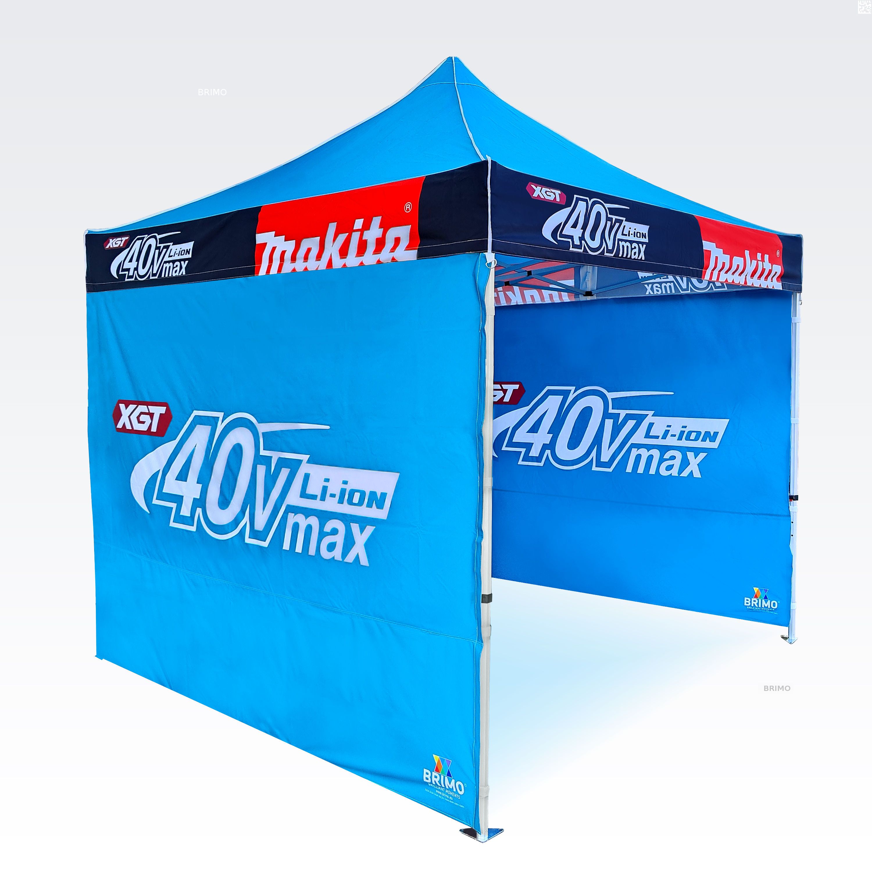 Tendas promocionais com impressão digital por sublimação. A impressão é obtida por meio de um processo químico, no qual a tinta, sob alta temperatura, penetra diretamente na estrutura do tecido. Logotipo, texto ou qualquer tipo de gráfico podem ser impressos no interior ou no exterior da tenda, de acordo com as preferências do cliente.