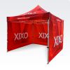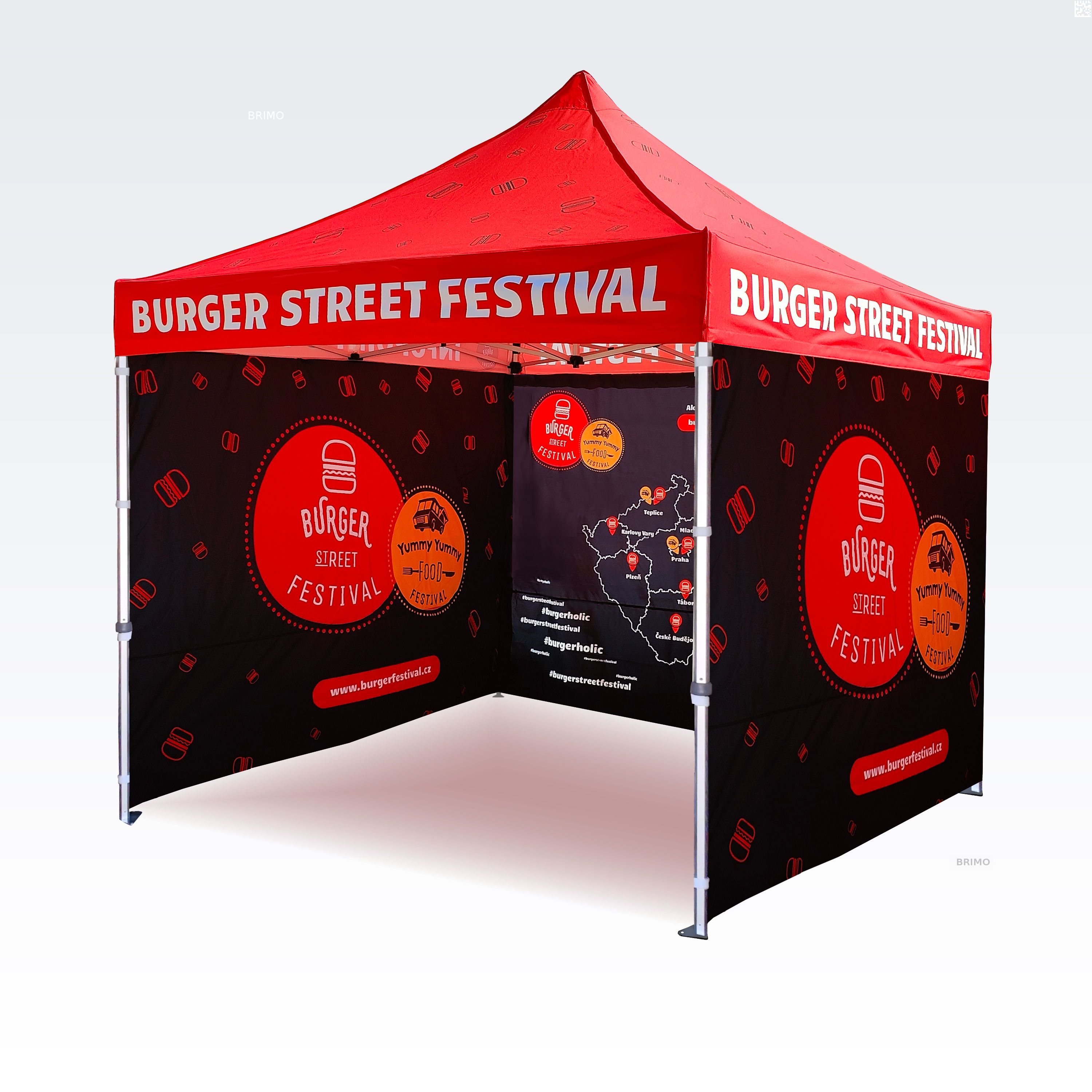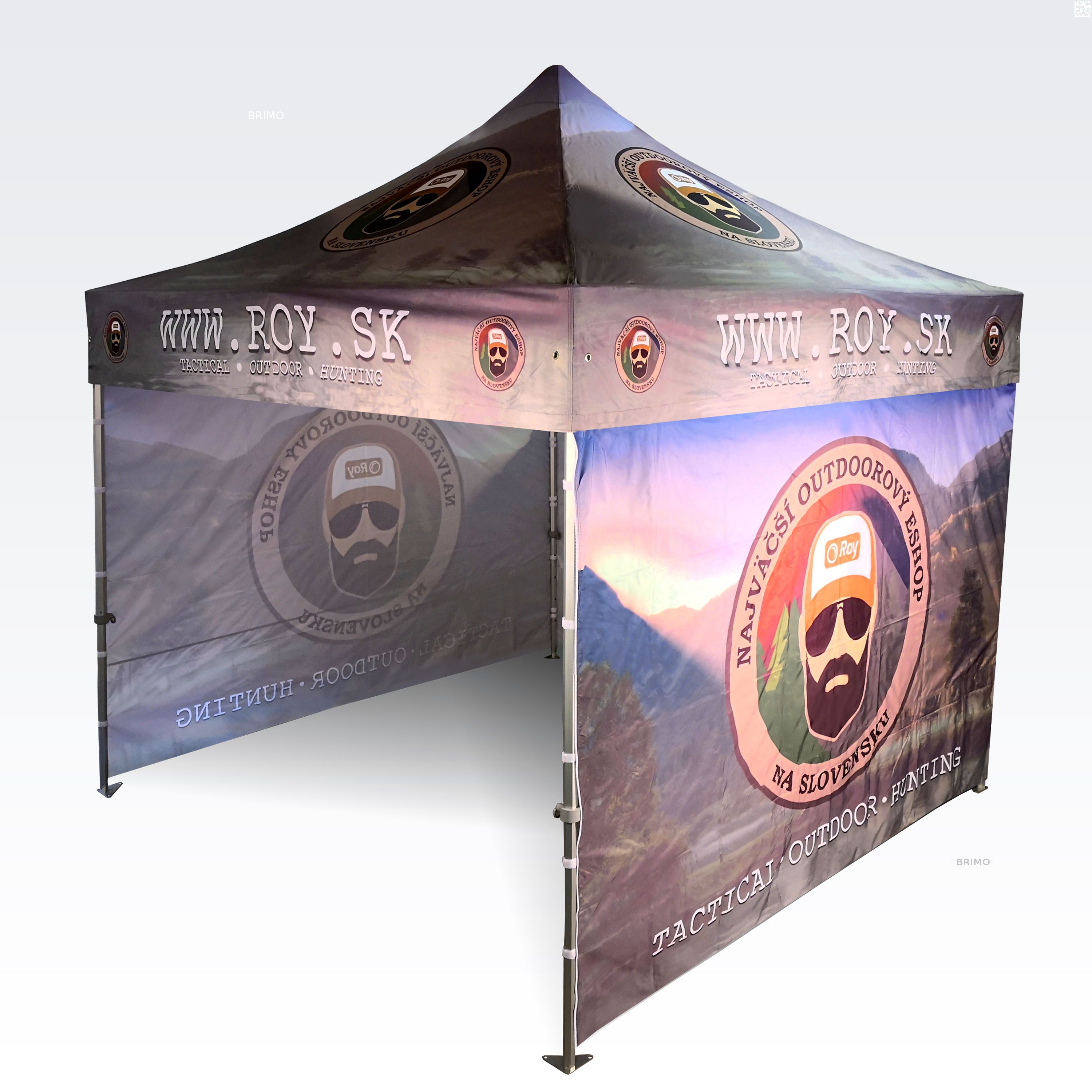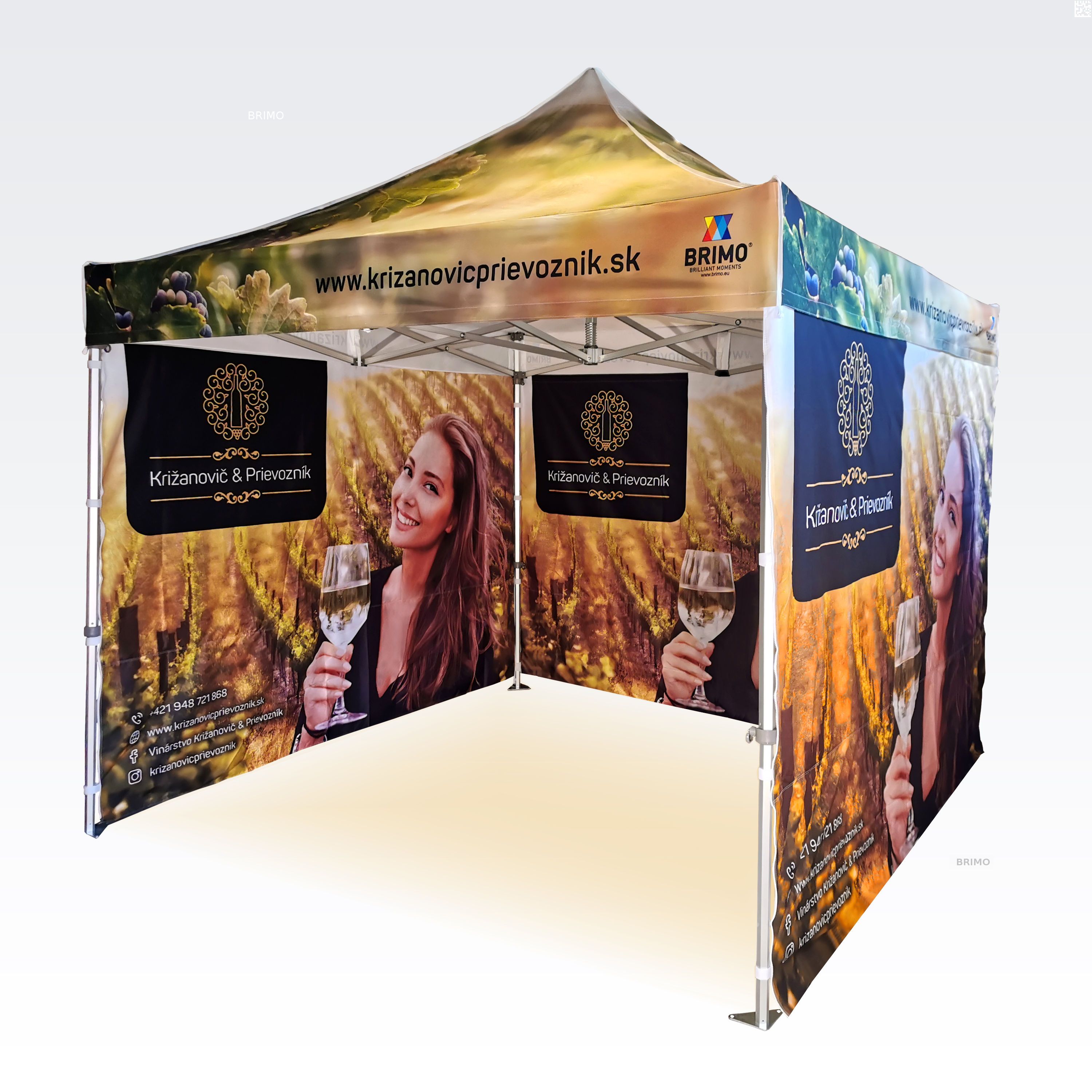 Tendas promocionais com impressão digital por sublimação. A impressão é obtida por meio de um processo químico, no qual a tinta, sob alta temperatura, penetra diretamente na estrutura do tecido. Logotipo, texto ou qualquer tipo de gráfico podem ser impressos no interior ou no exterior da tenda, de acordo com as preferências do cliente.