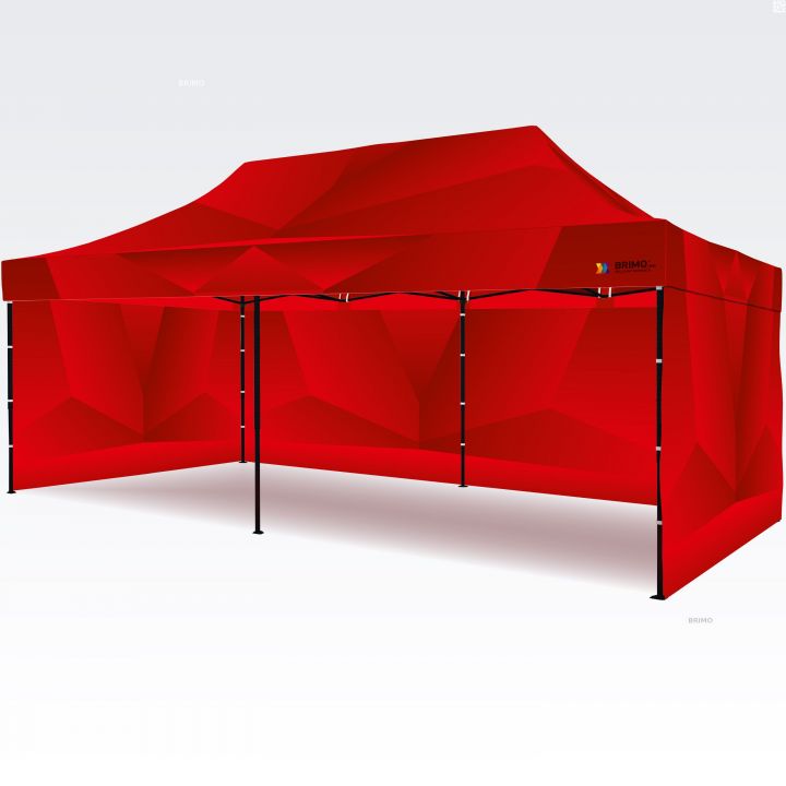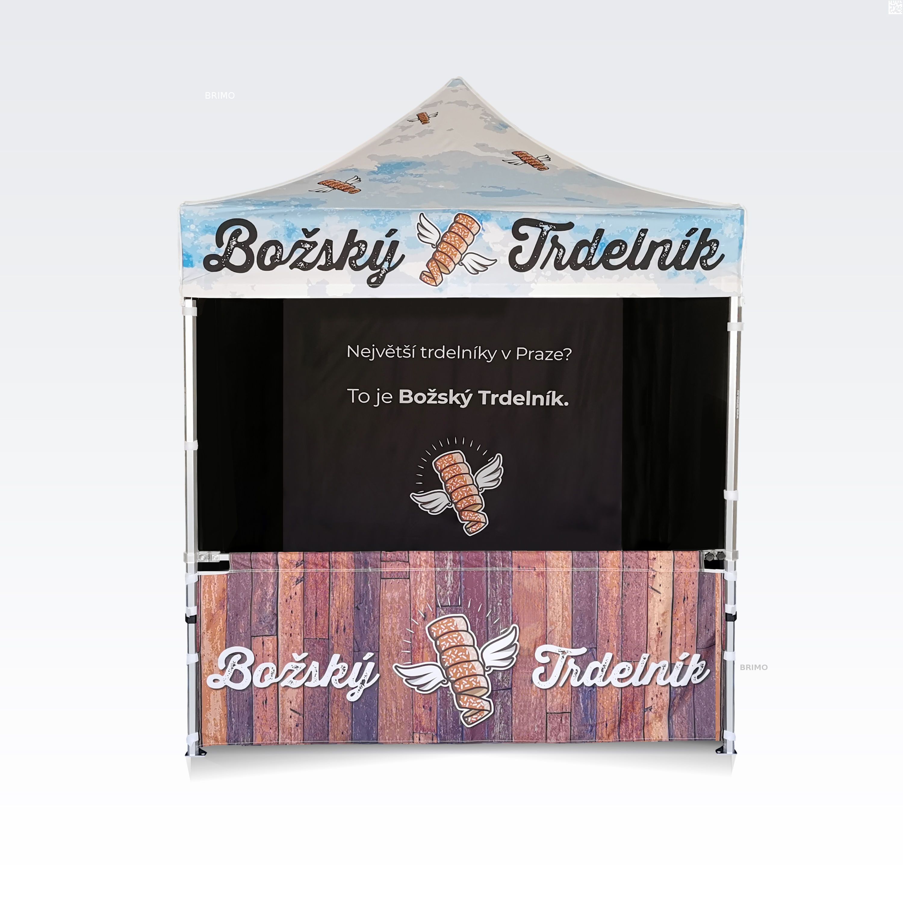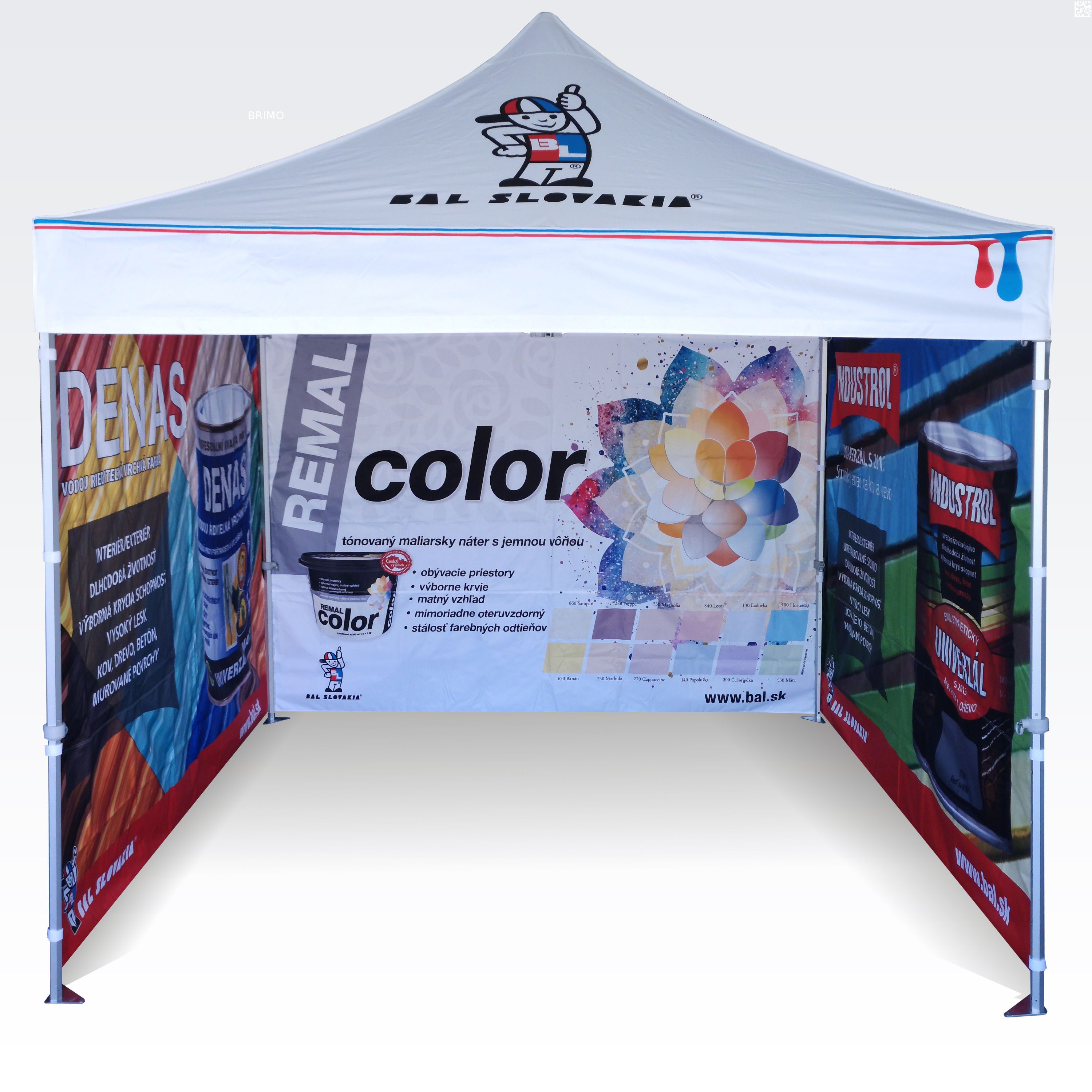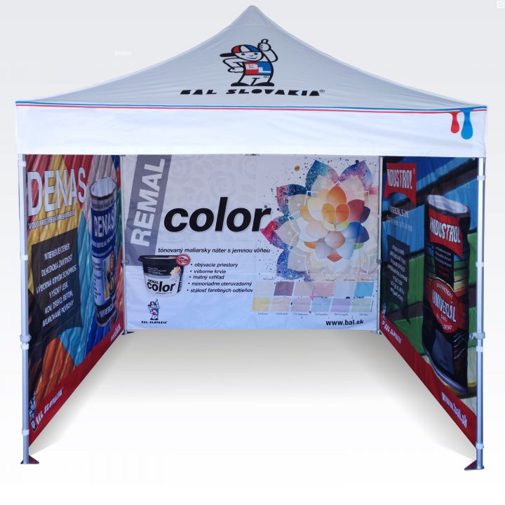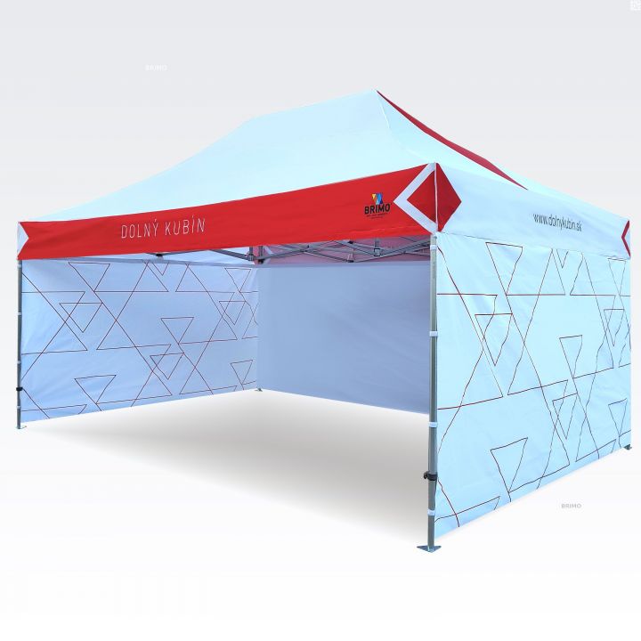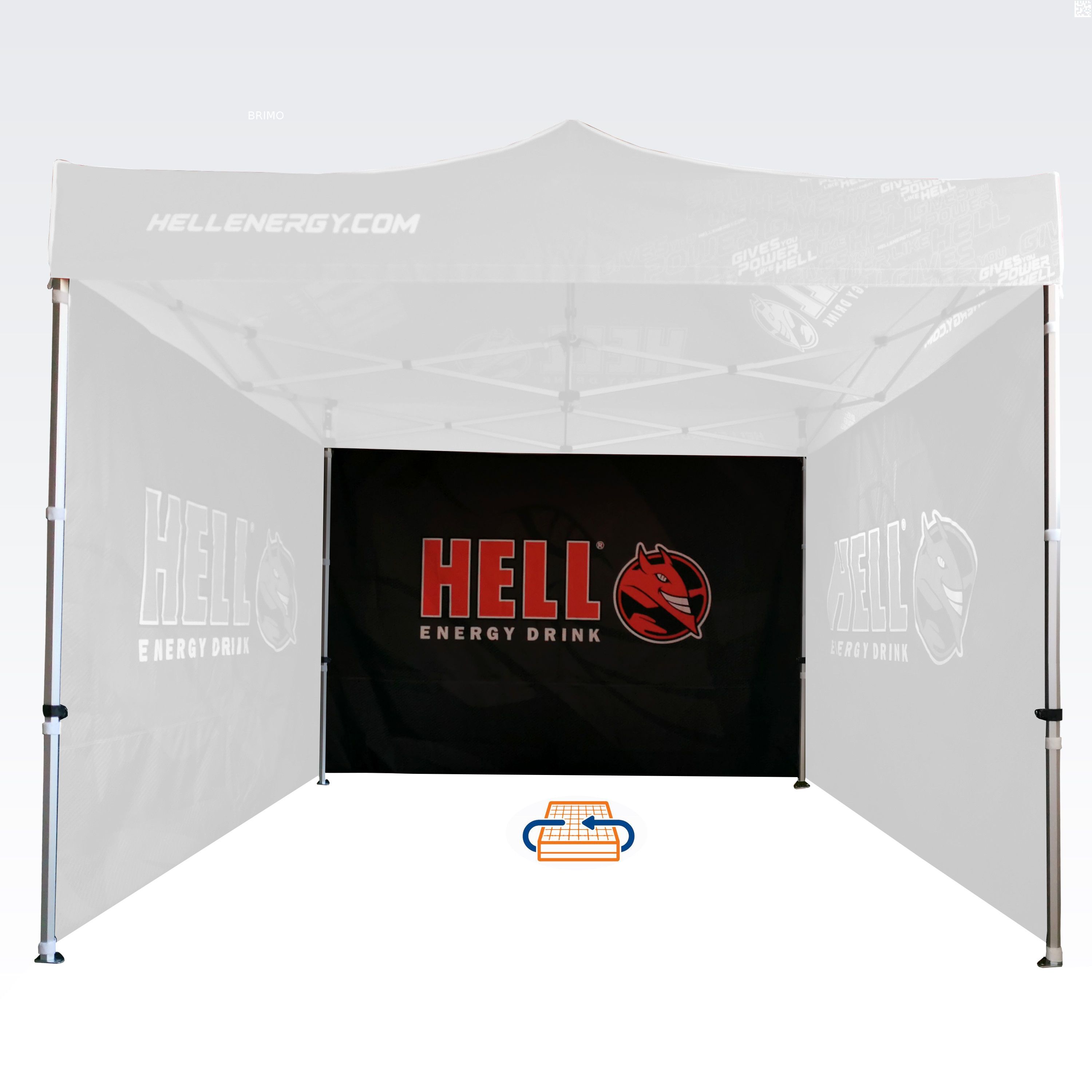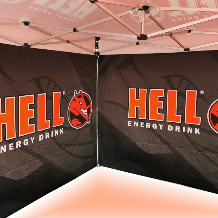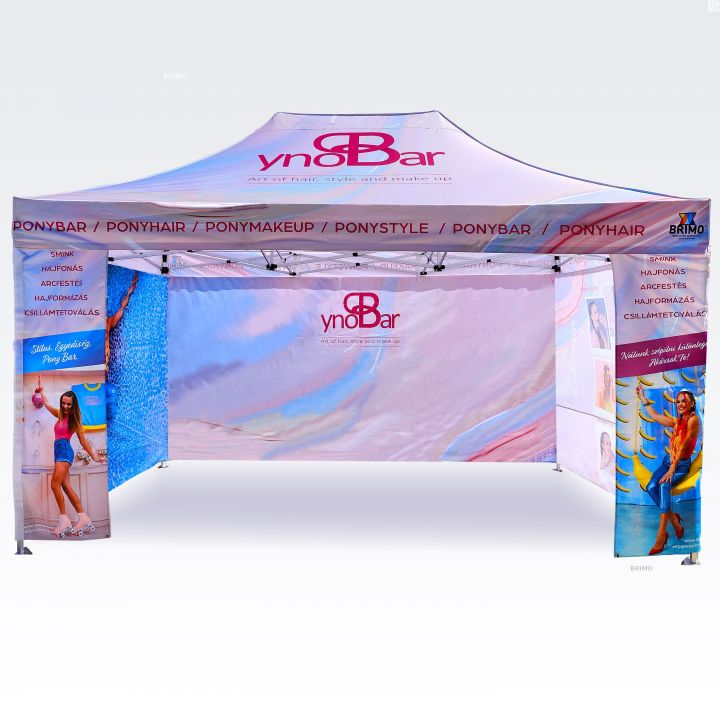 As cores são muito vibrantes, e esse método reproduz perfeitamente cada detalhe da impressão nas tendas publicitárias. As cores fortes e intensas chamam a atenção, e a sublimação garante longa durabilidade sem perda de cor. Com este método, independentemente do tamanho da impressão, o preço permanece o mesmo (o tamanho da impressão não influencia o preço das paredes ou do teto). Quanto maior a impressão, mais visível será a publicidade.