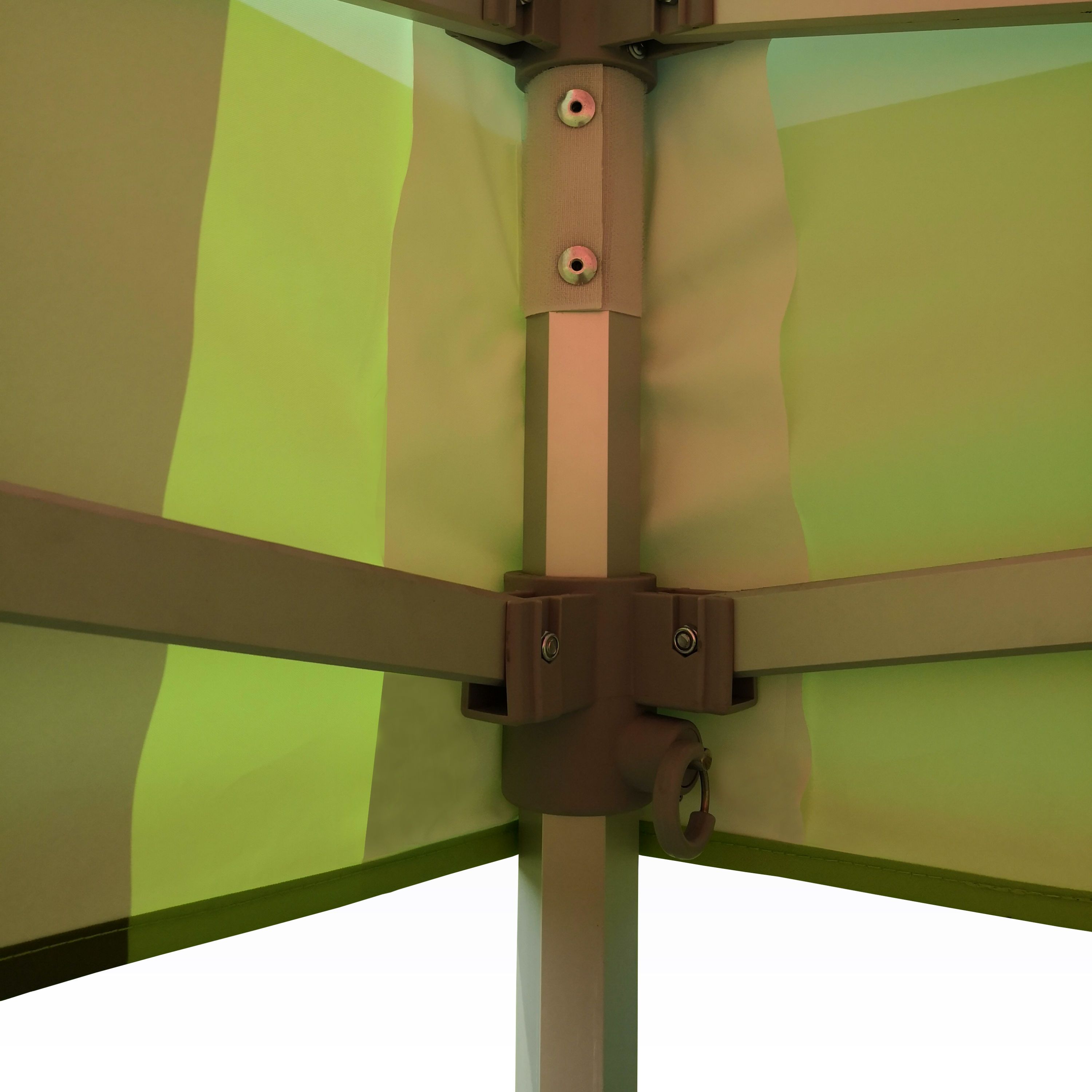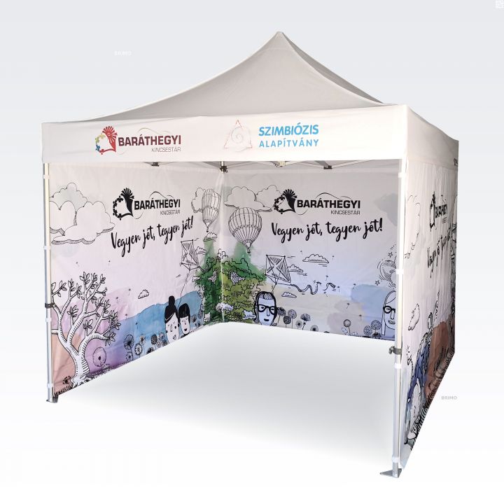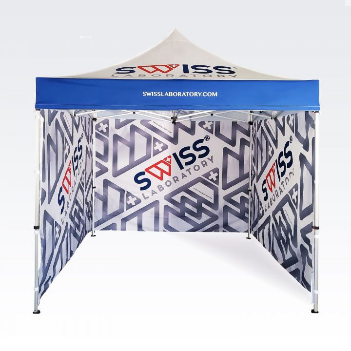 Tendas promocionais com impressão digital por sublimação. A impressão é obtida por meio de um processo químico, no qual a tinta, sob alta temperatura, penetra diretamente na estrutura do tecido. Logotipo, texto ou qualquer tipo de gráfico podem ser impressos no interior ou no exterior da tenda, de acordo com as preferências do cliente.